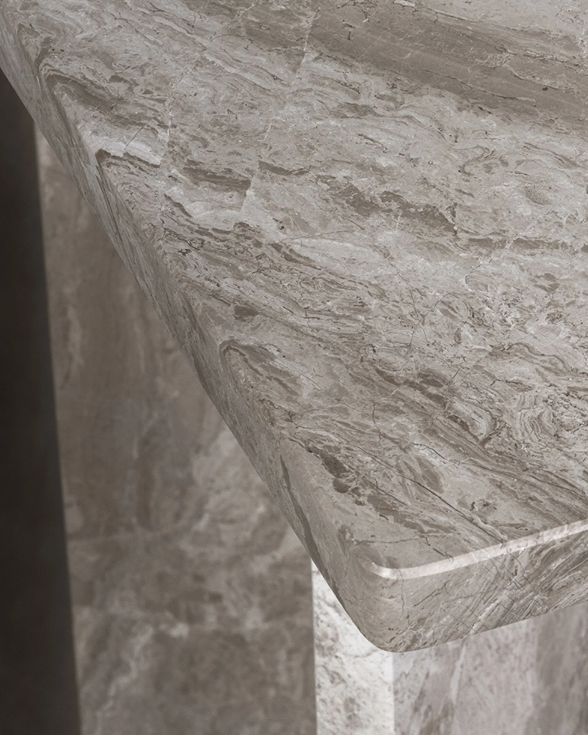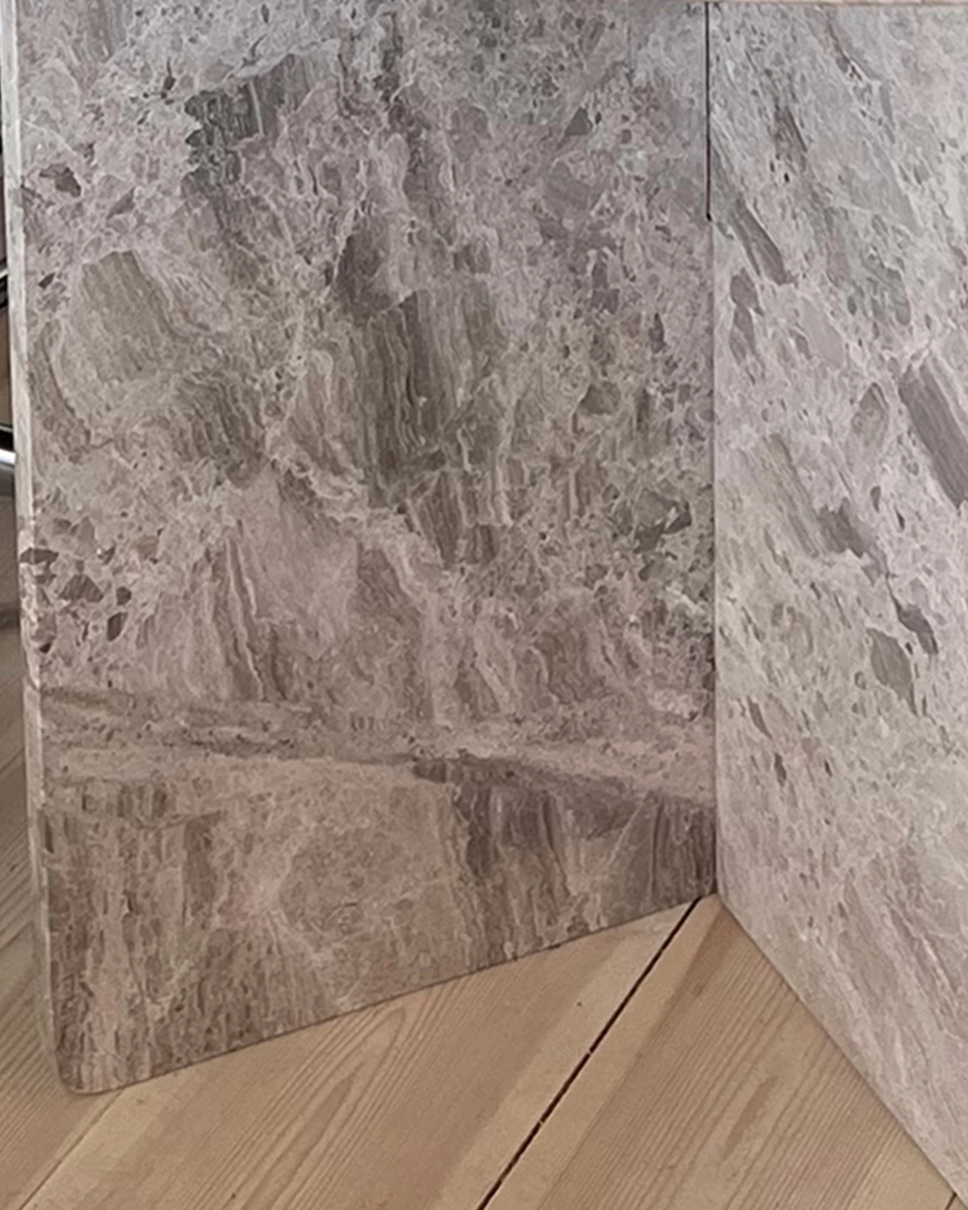 Ett högt sideboard i ljusgrå marmor.