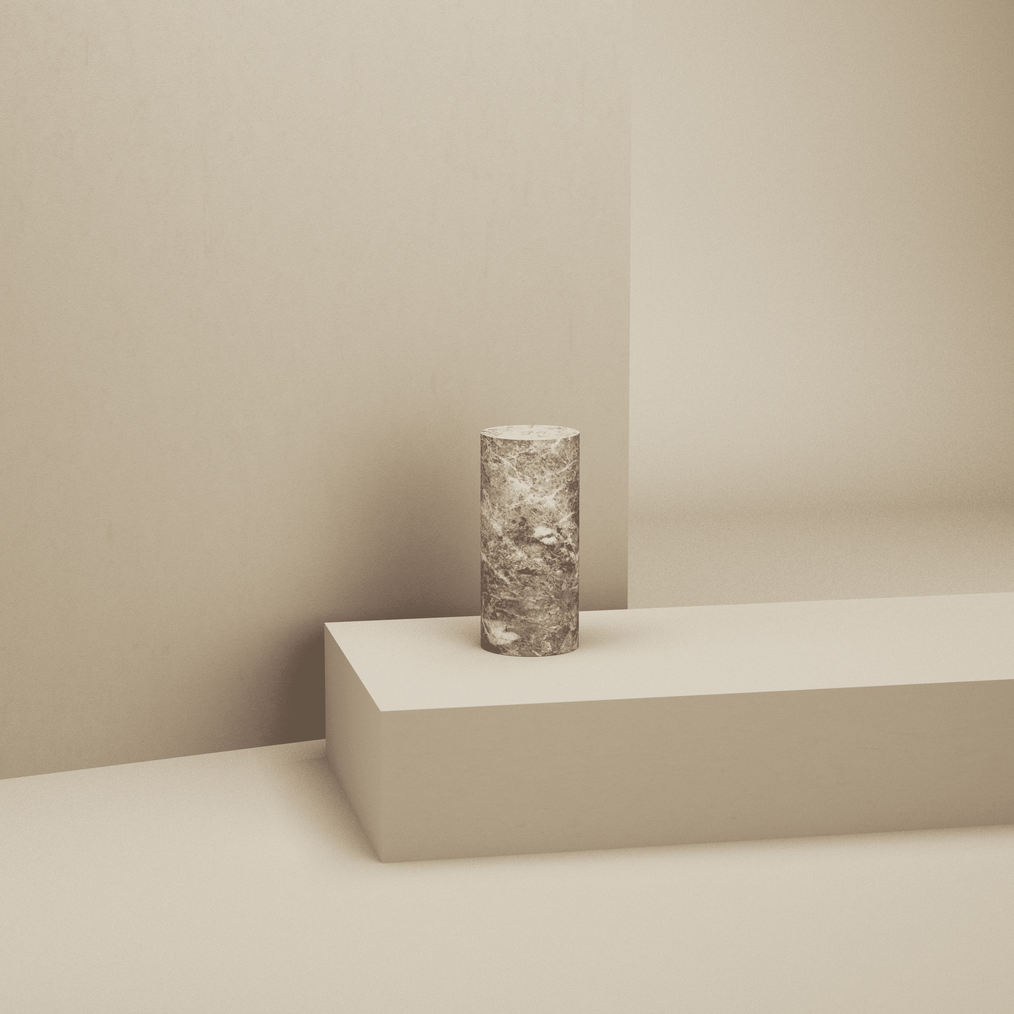 Exklusivt sidobord med pelar-ben, i grå/beige marmor.