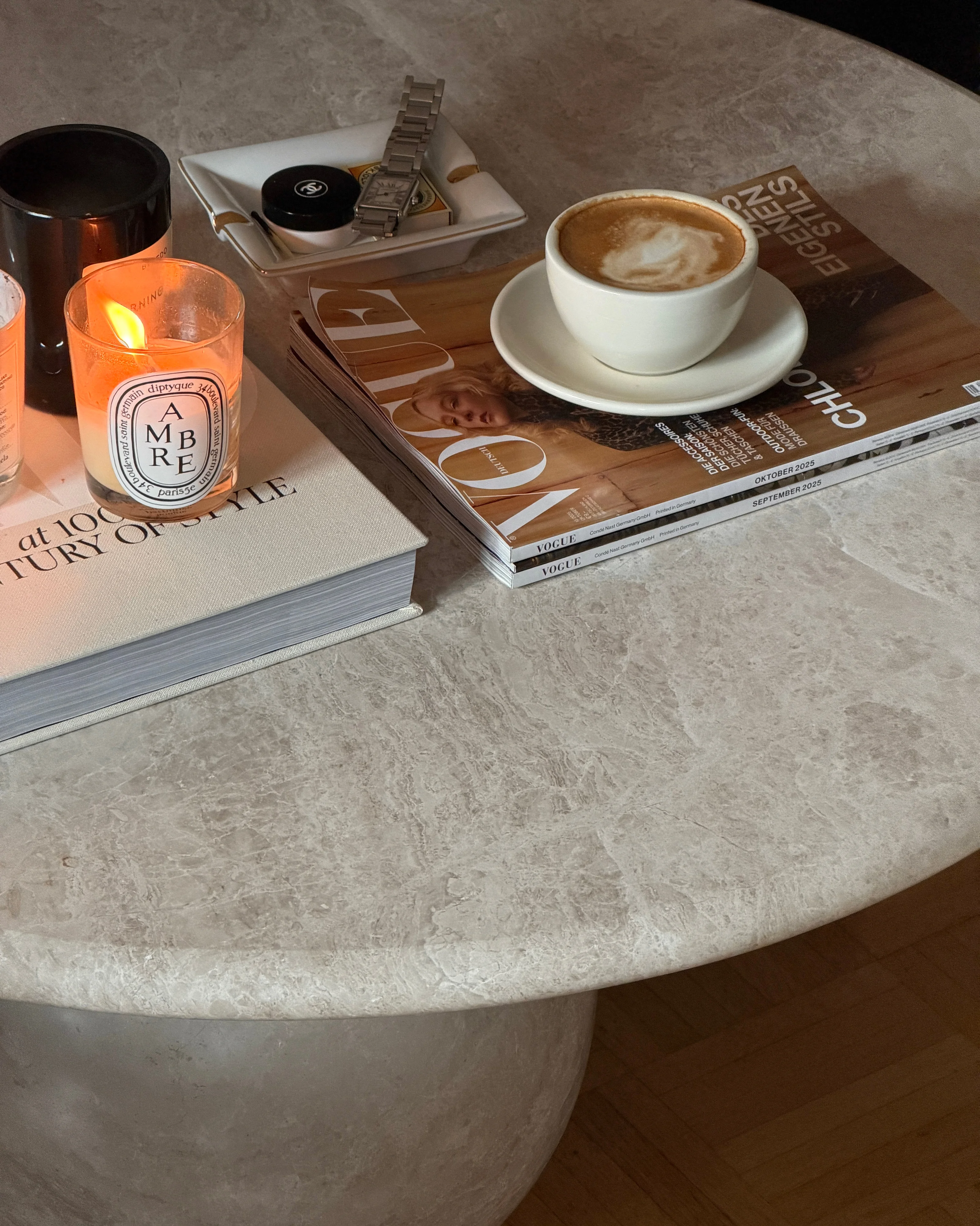 Exklusivt, runt soffbord med pelar-ben, i grå/beige marmor.