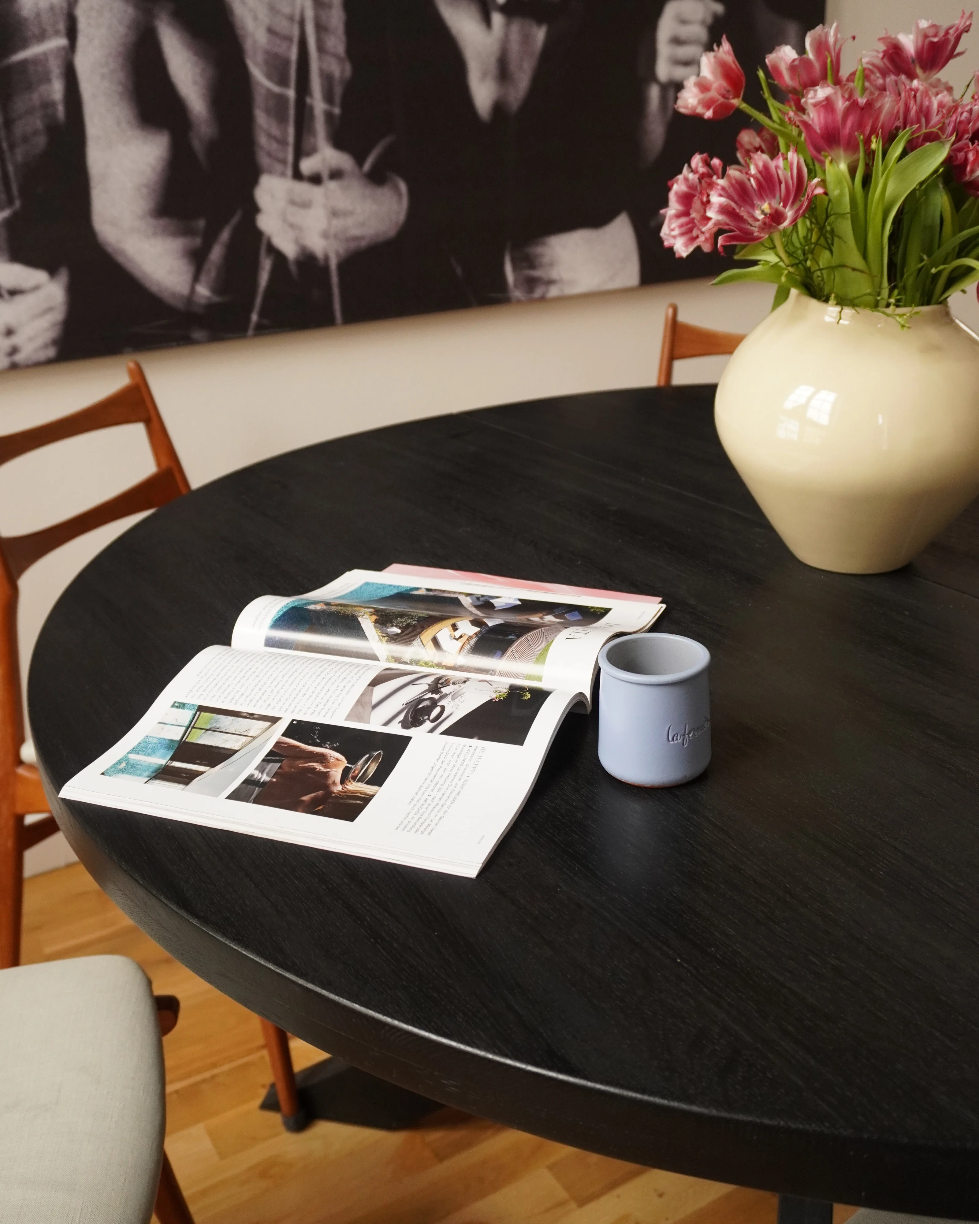 Helt enkelt - ett rymligt, runt köksbord att samlas många kring.
