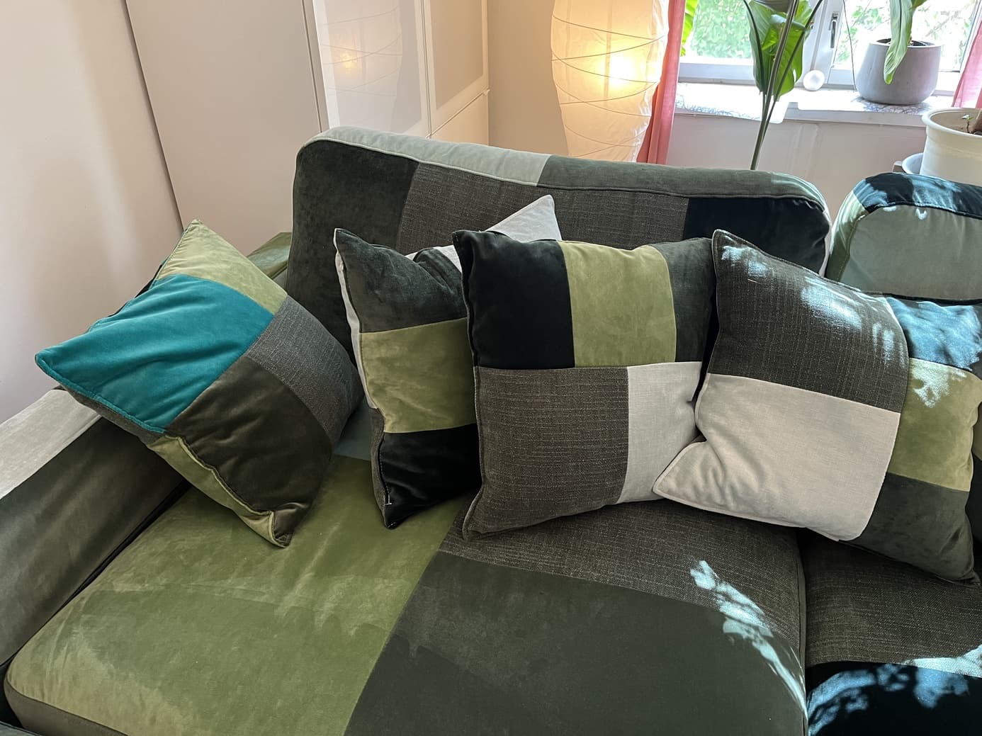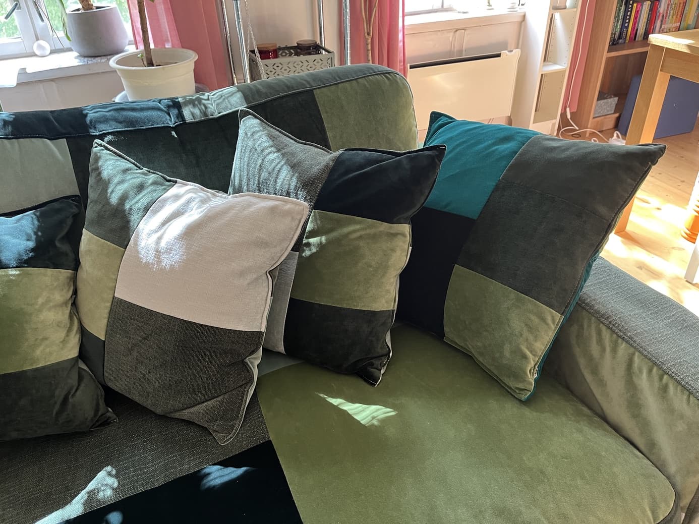 Jag beställde 2 extra kuddar till en lapptäckessoffa i gröna toner, men kuddarna har andra färger än soffan och puffen trots att de beställdes samtidigt. Lite besvikande att de inte matchar.