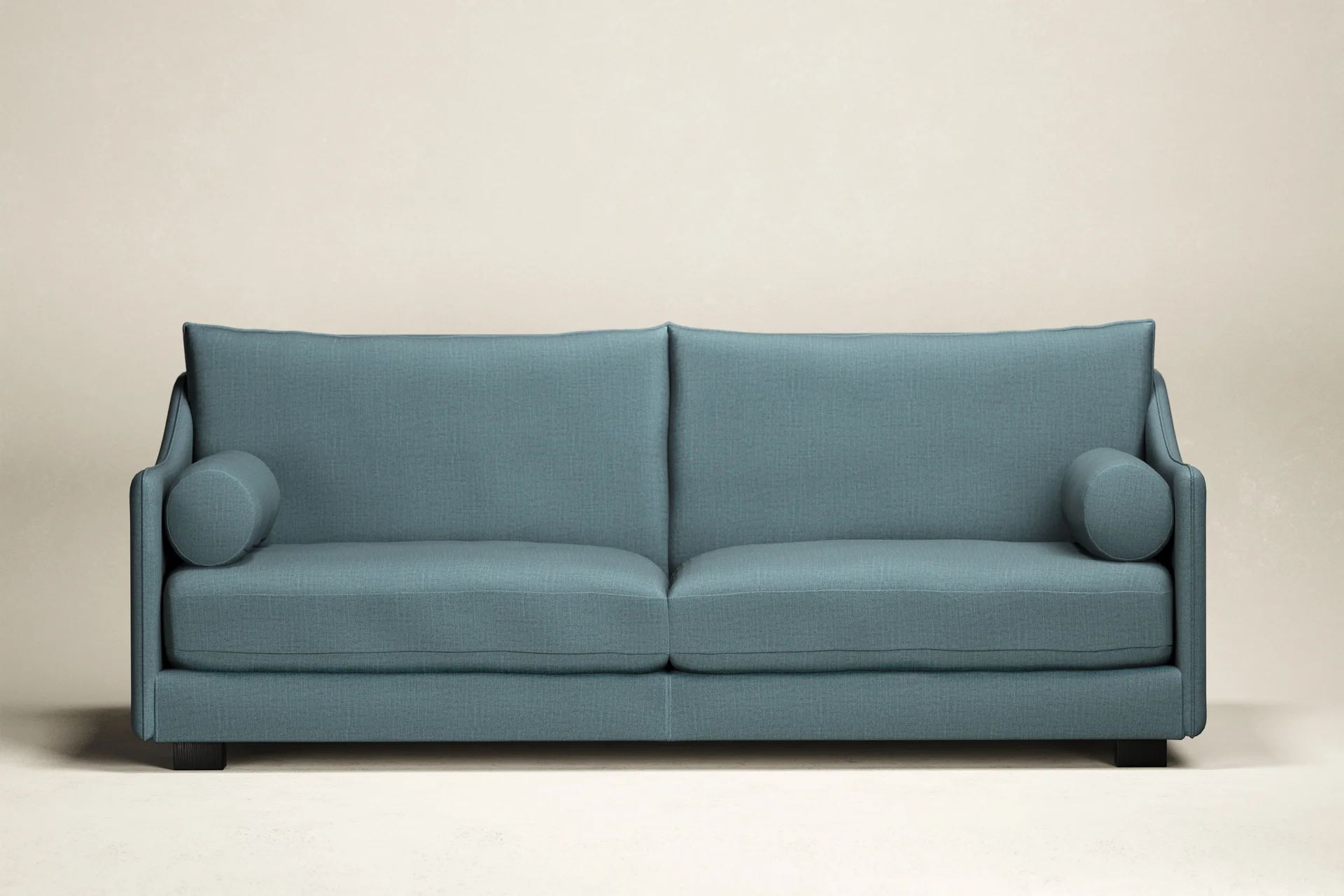 En elegant soffa med smäcker form och stilfull känsla med dekorativa cylinderkuddar vilandes mot armstöden.
