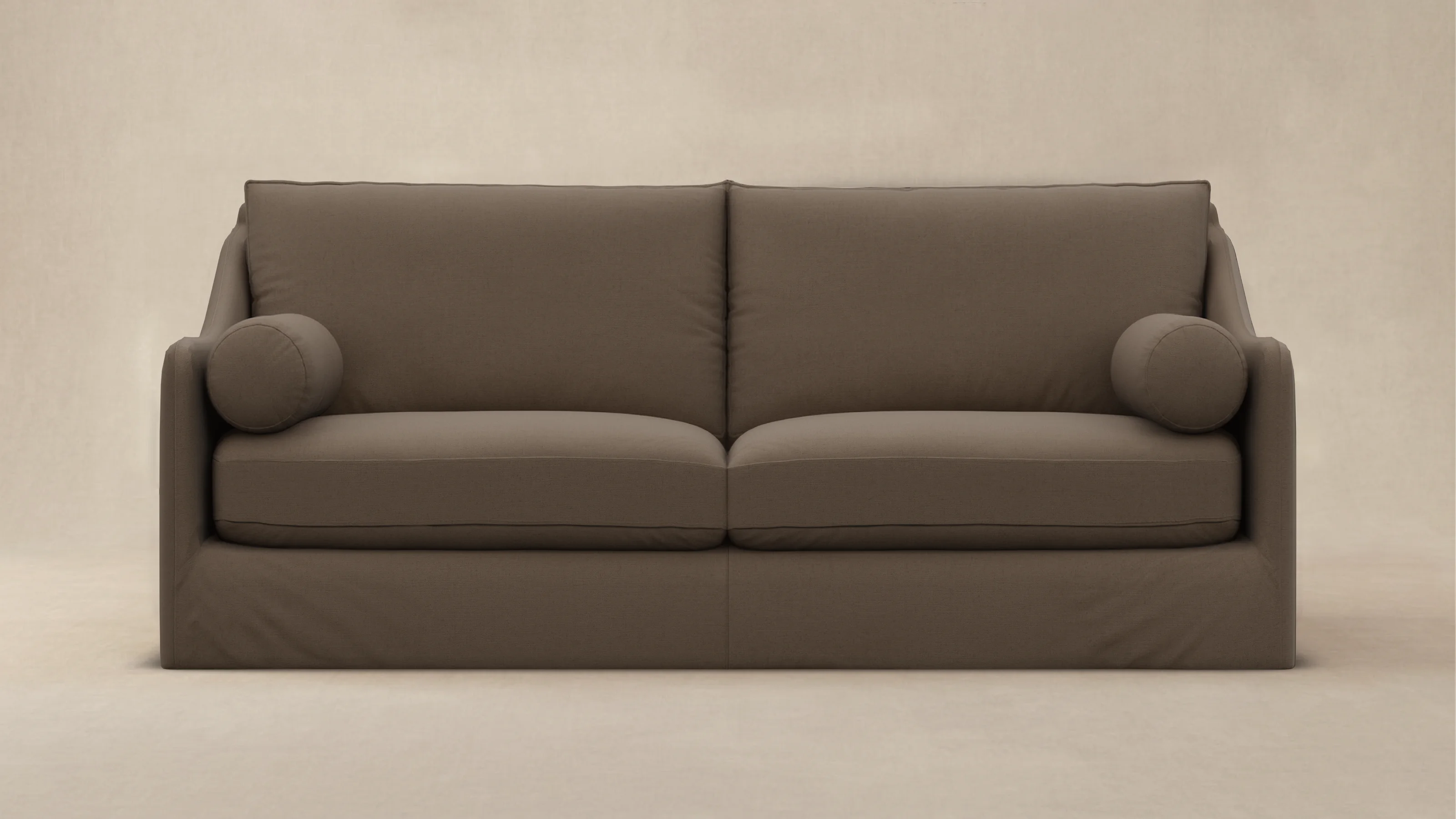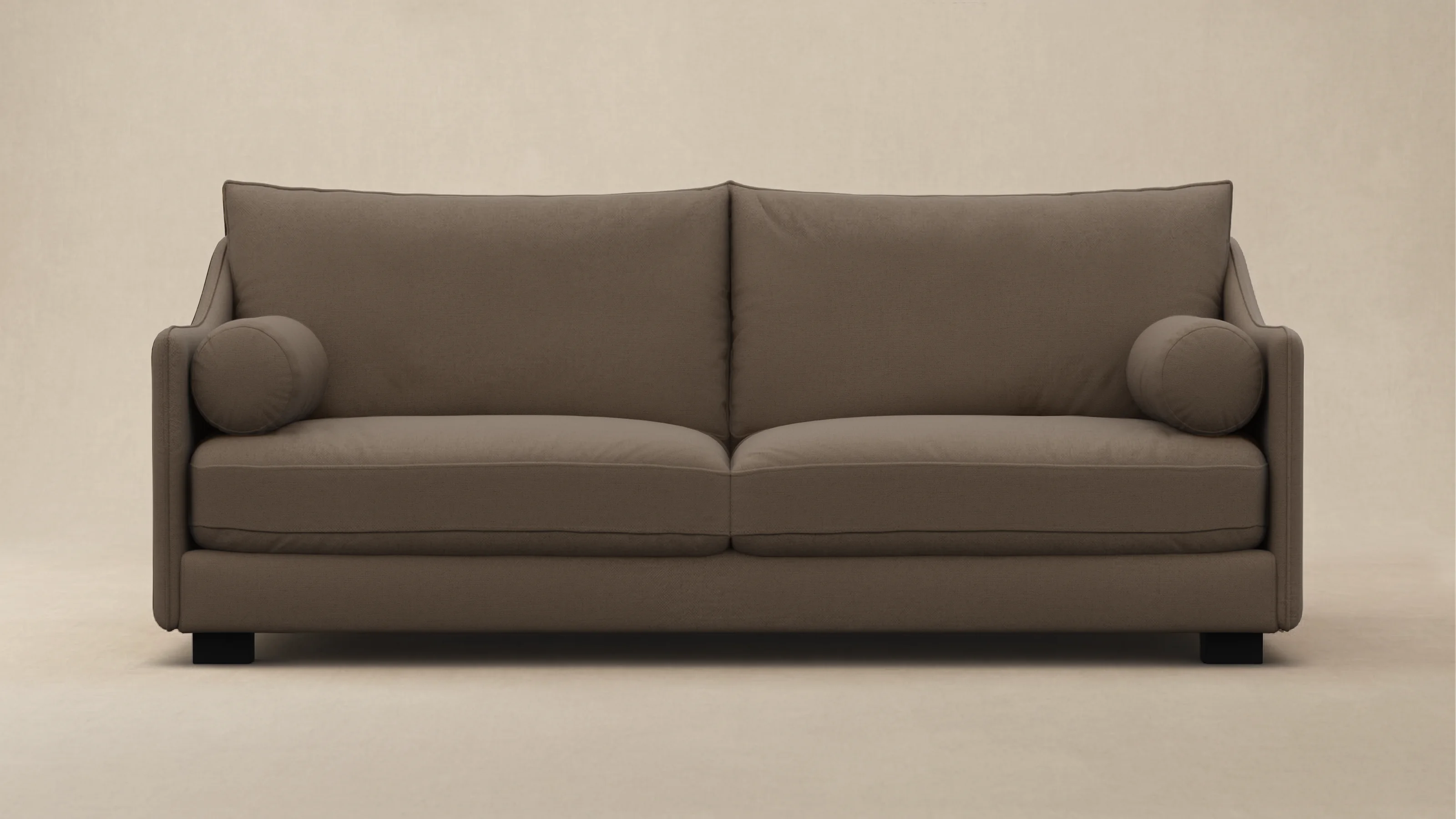 En elegant soffa med smäcker form och stilfull känsla med dekorativa cylinderkuddar vilandes mot armstöden.