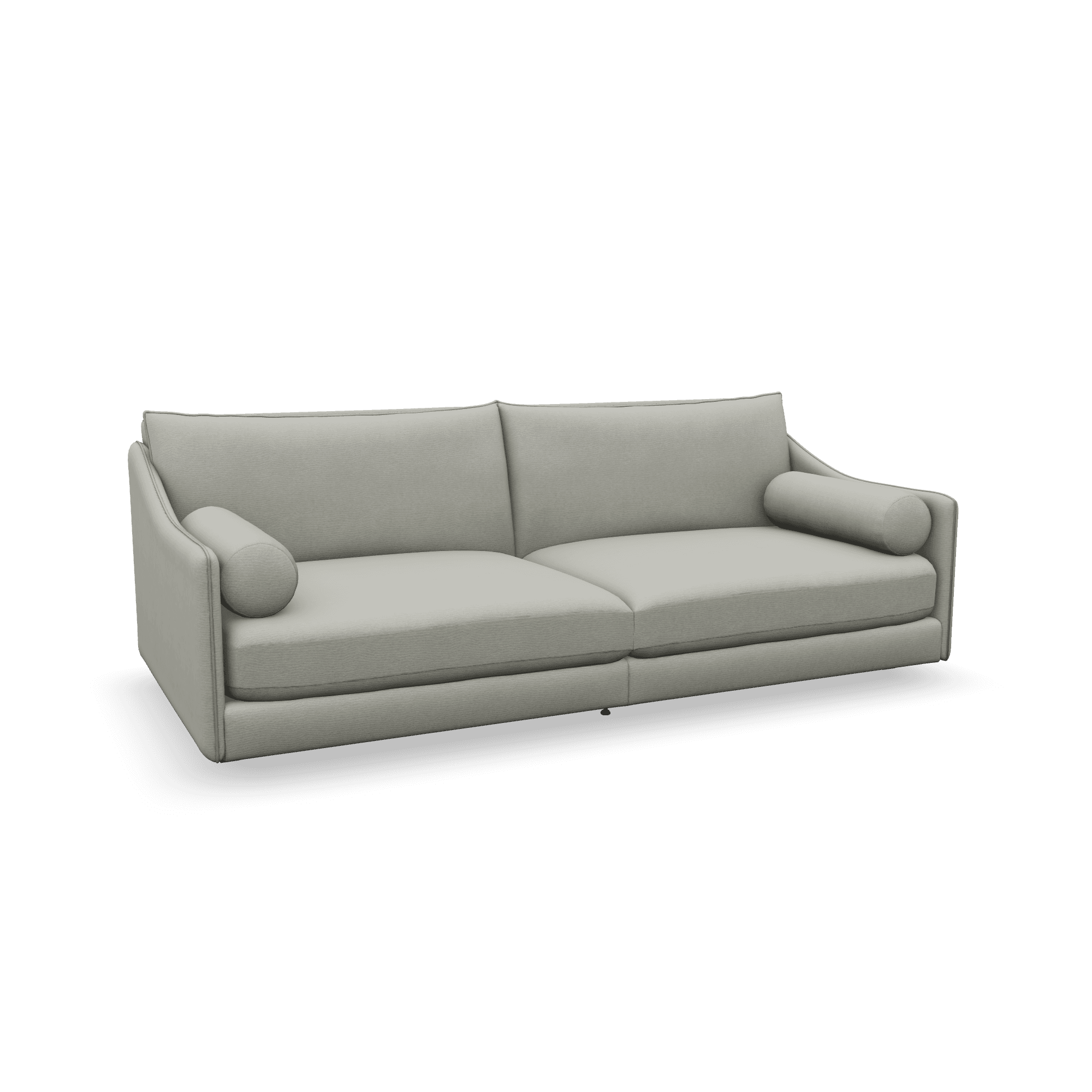 Soffan har en oväntat generös sittbredd tack vare de nätta armstöden med vackert utskuren form. Här kan du och två favoritmänniskor njuta av välbehövlig återhämtning. Du vilar nacken skönt mot de mjuka ryggkuddarna, helt utan dun - enbart i följsam kallskum, som omges av en hög, omfamnande rygg.