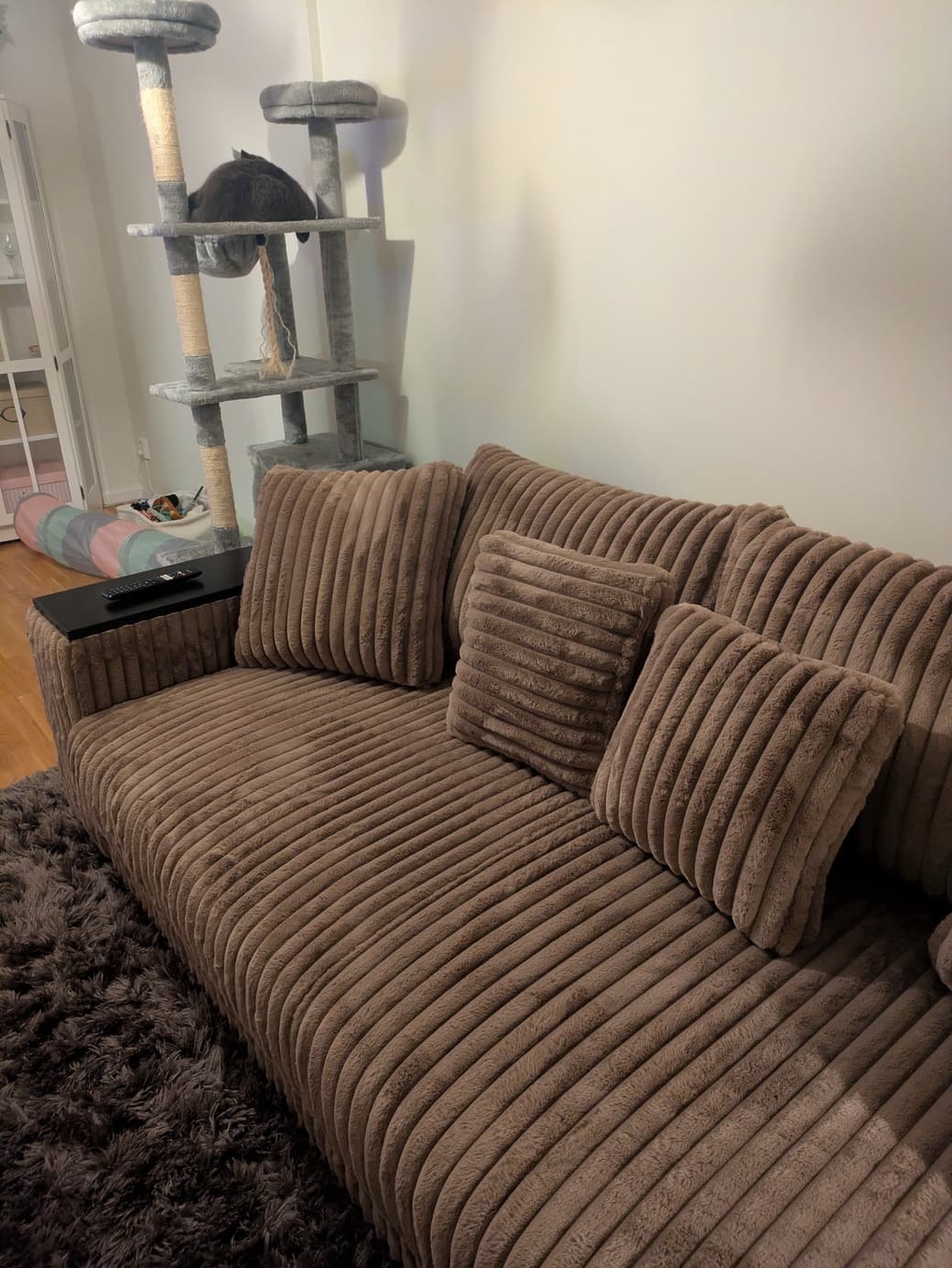 Hej Alva! Åh, vilka underbara bilder! 😻 Ser ut som att katten också trivs i soffan 🥰 Så kul att leveransen till Örebro gick smidigt och att soffan kom tidigare än beräknat! 🤩 Vito-tyget är verkligen så fluffigt och mysigt, det är härligt att höra att ni trivs så bra med det. Färgen Mullvad passar verkligen fint hemma hos er! Underbart att soffan fungerar lika bra att sitta i som att sova i. Tack snälla för det fina omdömet, det betyder så mycket för oss! 💛 Bästa hälsningar, Nils 🌻