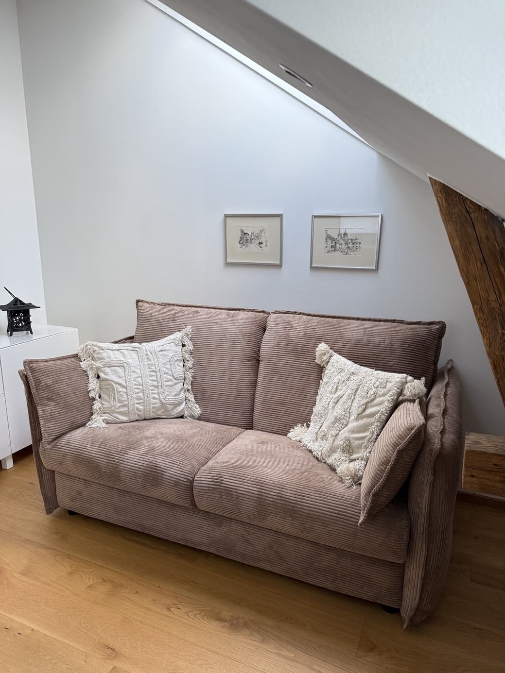 Skön som soffa att sitta i/vila på. Väldigt lätt att bädda upp och igen. Enligt våra gäster toppenskön att sova i både för en och två personer. Och vi tycker den är snygg att se på!