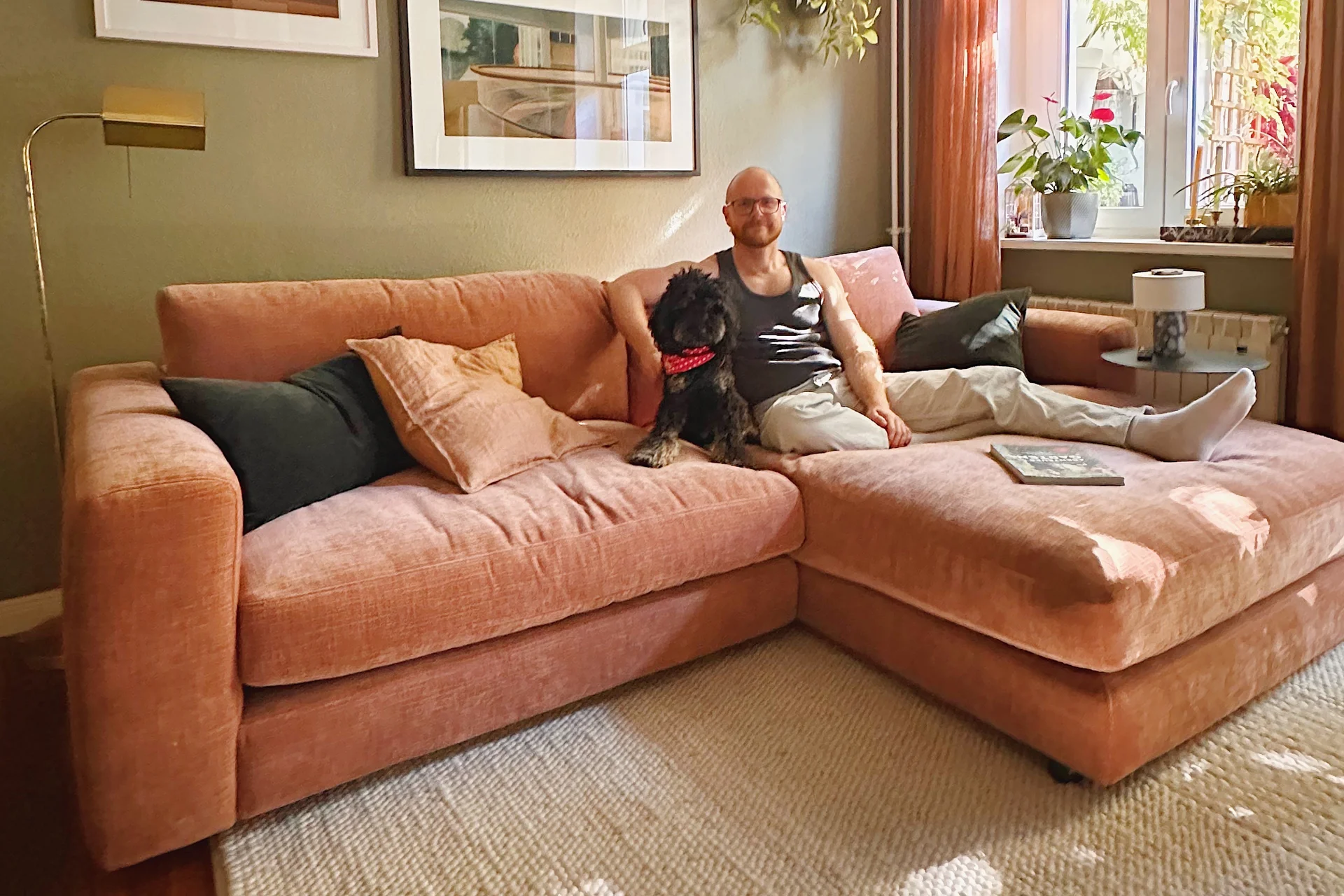Vi är så otroligt nöjda med den här soffan. Vi har ägnat lång tid åt att jämföra soffor, kolla tygprover och prova dem i utställningslokalen. Det slutade med en armégrön Mammut med fyra moduler, och den blev så fin. Skön och djup, mjuk och mysig – alla i familjen älskar den. Den enda nackdelen är att benen som följer med är låga, men tillräckligt höga för att damm och småsaker ska hamna under. Soffan är stor och tung, så den är inte lätt att komma åt när något hamnar under den. Vi har både barn och hundar, så vi måste beställa några extra ben för att höja den några centimeter.