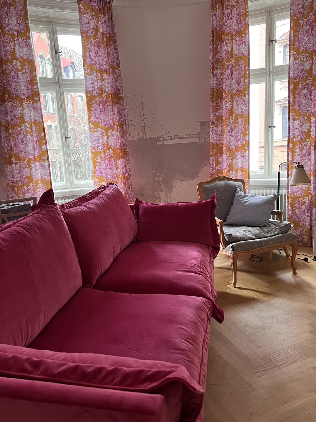 Perfect fit i både mitt runda rum och med mina gardiner! Lite piff återstår sen blir det favoritrummet med underbara soffan ❤️. Äääälskar färgen🤩