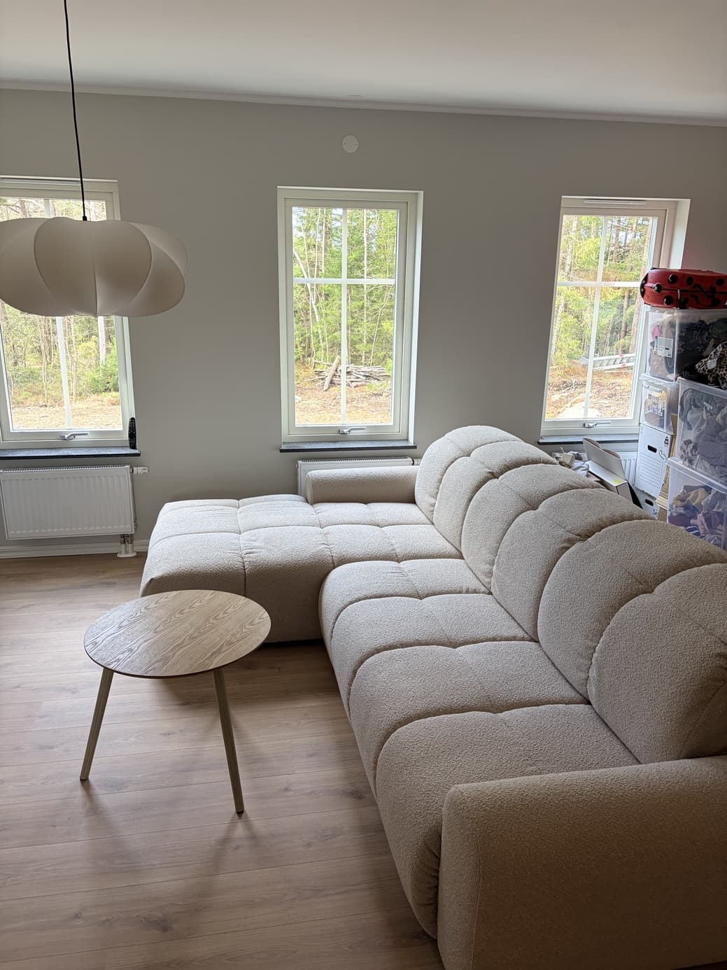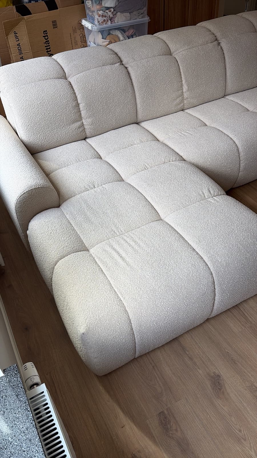 Hade panik för att vi inte skulle få upp soffan på vår övervåning, bollade flera gånger med kundservice och fick bra hjälp av Majken! tack och lov kunde man ta loss ena armstödet enkelt och med lite krångel och styrka gick det ändå. Det står att kolli ska vara 90cm men är bara 84 ungefär, vilket var glädjebesked. Var nära att avboka den flera gånger under leveranstiden 🙈 vi är så nöjda! Den är som många skriver ganska hård, men hoppas på att den ska mjukna med tiden. Väldigt maffig pjäs som gör hela rummet, vi är så glada för vår Valross 😍